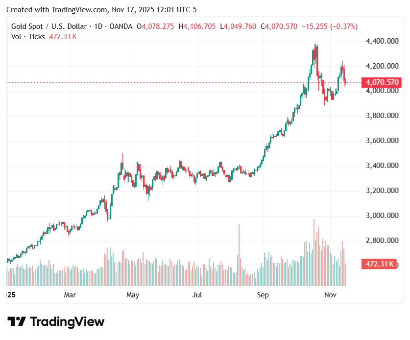 现货黄金报于每盎司4069美元附近,在稍早短暂升至每盎司4100美元上方后,当日下跌0.3%。美国黄金期货也出现类似走势,交投于每盎司 4,071 美元附近,下跌 0.5%。