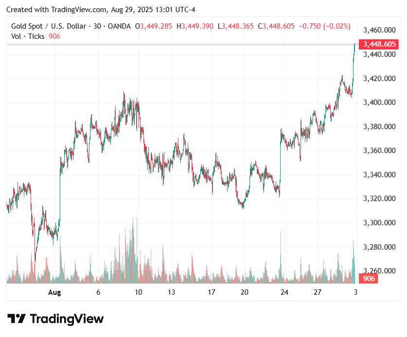 截至美国东部时间下午12:40,Spot Gold上涨了0.8%,至3,445.87美元,这是自4月以来最佳月份的正轨。美国黄金期货跃升了1.1%,至$ 3,513.50,每盎司仅$ 20,距离新纪录高20美元。