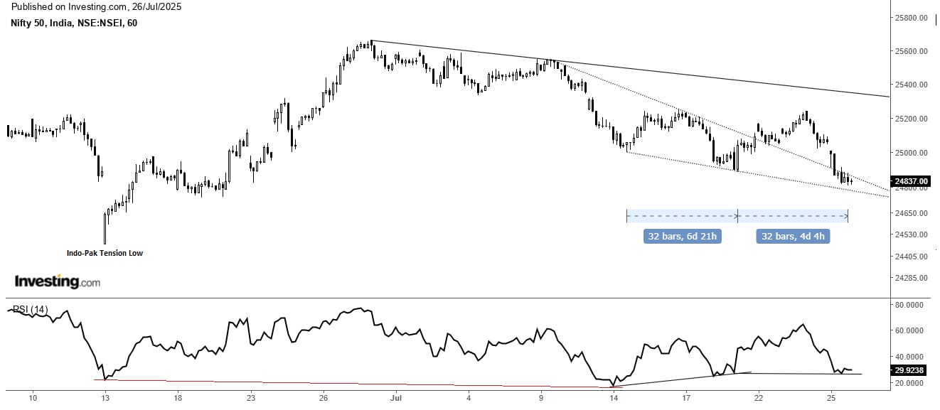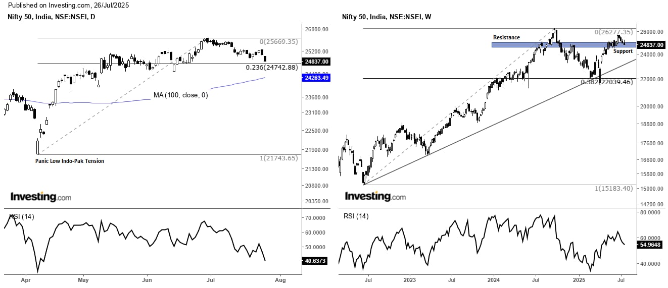 从技术上讲,Nifty 50在其20天和50天的移动平均水平下打破,目前正在测试24,800–24,900区附近的支持。 RSI的滑坡低于50,表明动量弱。