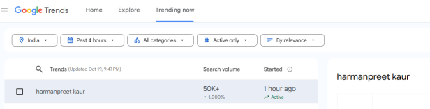 在这场惊心动魄的比赛中,Harmanpreet Kaur 在 Google 上的搜索热度飙升。晚上 10 点左右,Kaur 的活跃搜索量已超过 50,000 次。