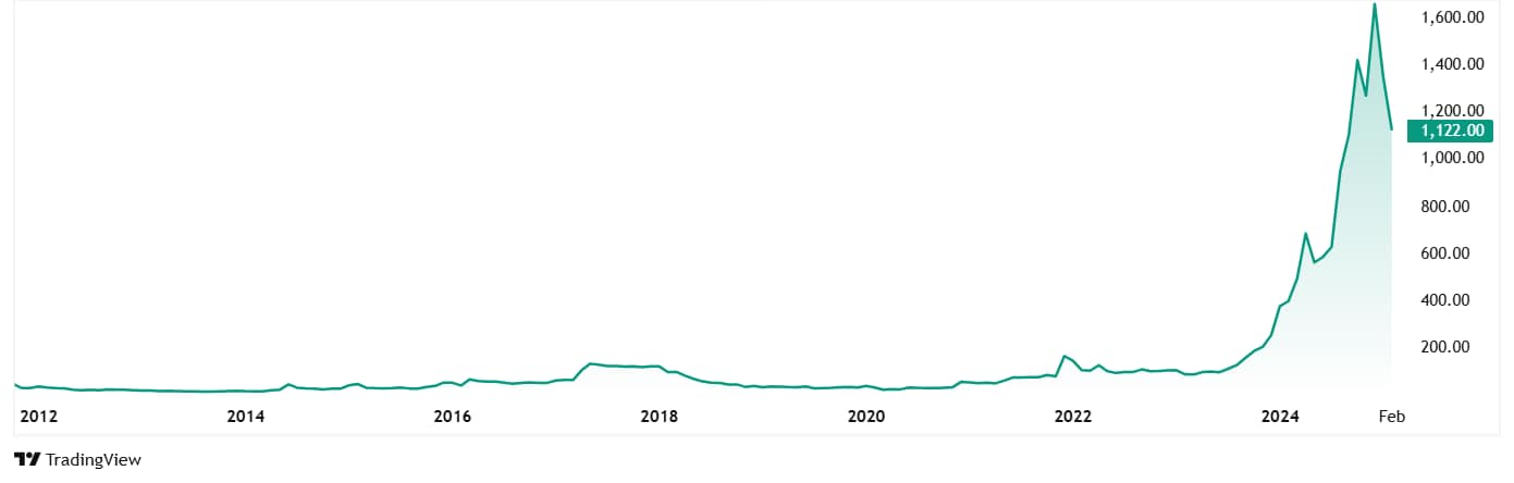 所有这些汇集在一起也推动了WESL的股价。它从2022年12月的92卢比增长了目前的价格为1,131卢比(截至19号Th 2025年2月),在短短两年内,这是惊人的1,129%。