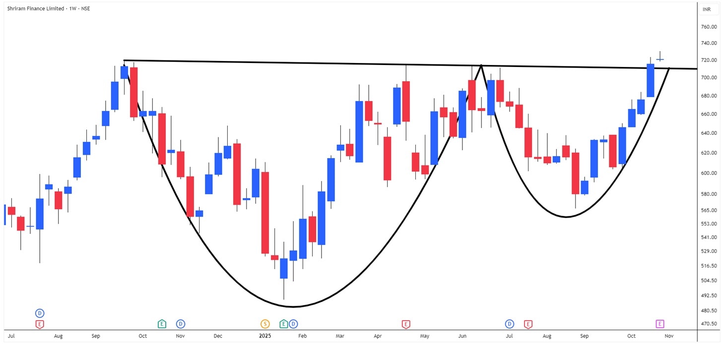 在 Shriram Finance 的周线图上,该股正在形成杯柄形态,令人信服地突破了 52 周高点。