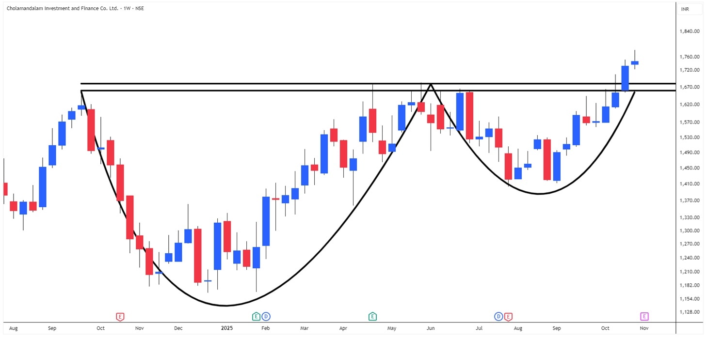 CHOLAFIN 的周线图显示了一种称为杯柄的长期看涨模式。