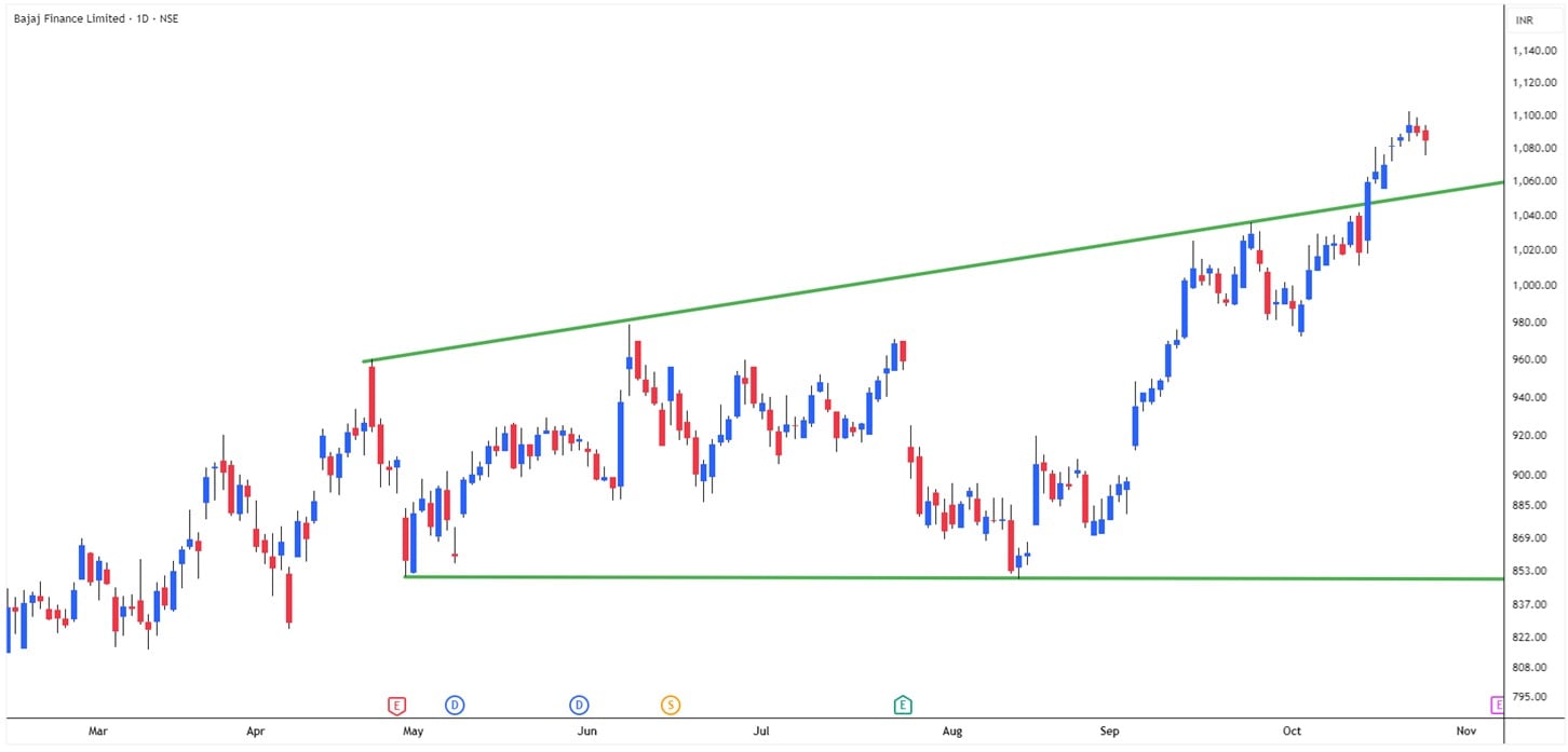 在 Bajaj Finance 的日线图上,价格正在扩大三角形中盘整,这是一种高点更高、低点更高的看涨突破模式。