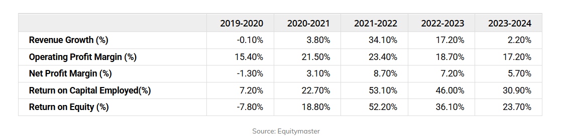 在2020 – 2024年之间,销售和净利润分别报告了6.4%和24.6%。该公司的平均ROE和ROCE分别为4.6%和5.7%。