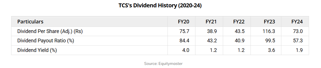 TCS是一家现金丰富的公司,以奖励其股东大量奖励。在过去五年中,其平均股息支付比率为65%。