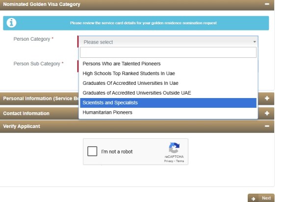 在阿联酋政府网站上申请黄金居住的过程,称为“签证金居住地提名为黄金居住的请求”。