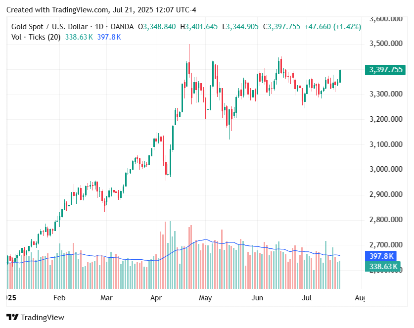 在美国东部时间中午中午,现货金上涨了1.4%,至3,397.51美元,自6月中旬以来首次触及了3,400美元的水平。