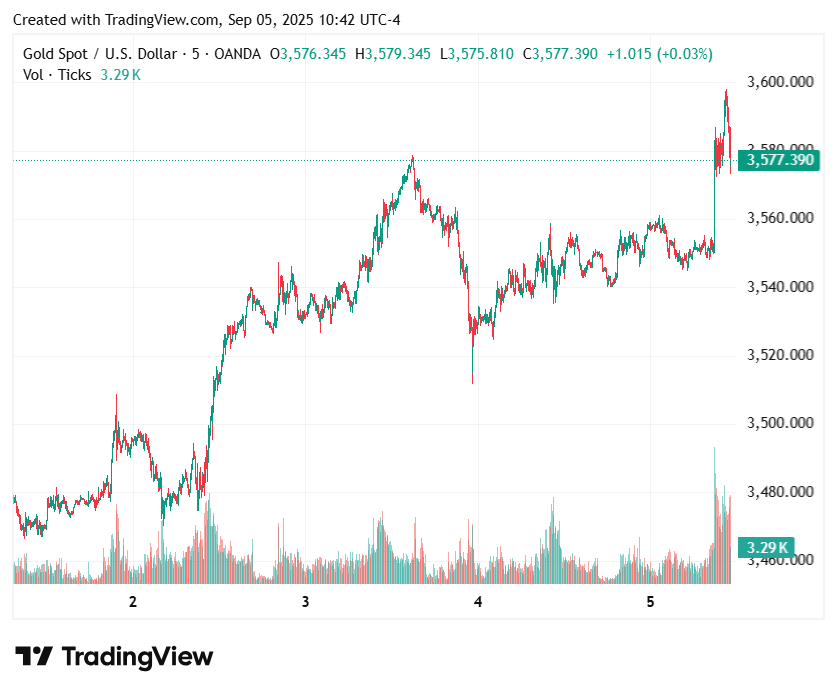 周五,黄金炸毁了新的历史新高,每盎司3,600美元,因为新鲜的工作数据进一步巩固了对本月晚些时候降低美联储降低的市场范围内的期望。
