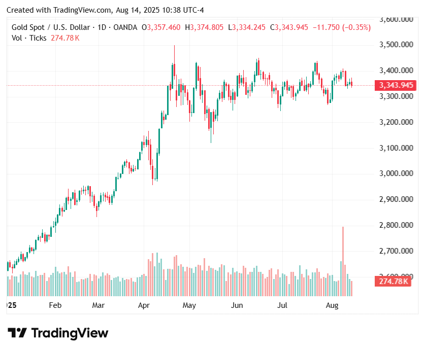 到达美国东部时间上午10:30,现货黄金下降了0.3%,至3,344美元左右,而美国黄金期货在纽约下降了0.4%,在纽约每盎司3,394美元左右。