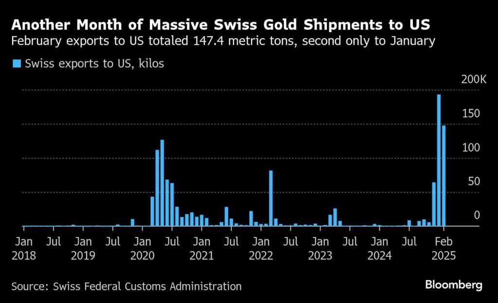大部分供应来自瑞士,该数据在一月份的数据回到2012年,将最多的黄金运送到了美国。2月的数据也很高。