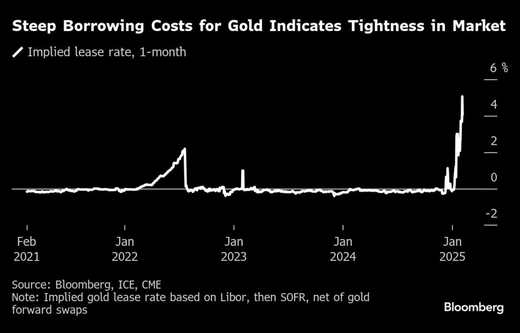 在金条的一个月租赁率中可以看到这种紧密度,该租赁率跃升至约4.7%,远高于通常水平接近零的水平。该利率反映了伦敦金银城的金条持有人可以通过短期借入金属来获得的回报。