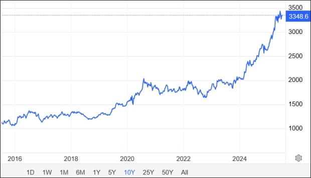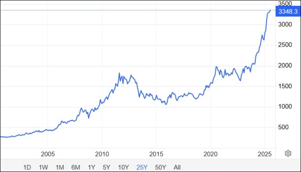国际市场的黄金今天约为3,340美元。在2009年10月至2024年1月之间,黄金花了将近12年的时间从$ 1,000升至2,000美元,但它仅花了14个月才能搬出1,000美元以超过3,000美元。