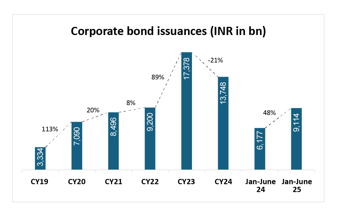 在过去的几年中,印度的公司债券发行一直在上升。我们已经看到发行在2023年达到顶峰,同比增长了89%,达到173.78亿卢比。跳跃可能是由多种因素驱动的,包括利率上升和COVID之后的经济气候不断提高。到目前为止,CY 2025的上半场也令人印象深刻。公司,特别是在房地产,基础设施和非银行金融公司(NBFC)等领域的公司,越来越多地转向债券市场筹集资金。