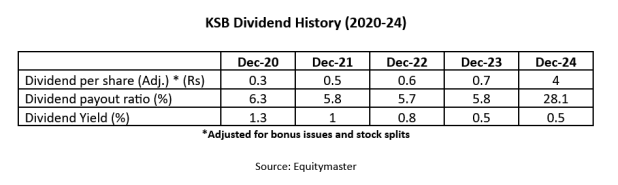 2024年6月,该公司宣布最终股息为每股17.5卢比。值得注意的是,在2024年7月,KSB还进行了股票拆分,将其股票的面值从10卢比降低到2卢比。
