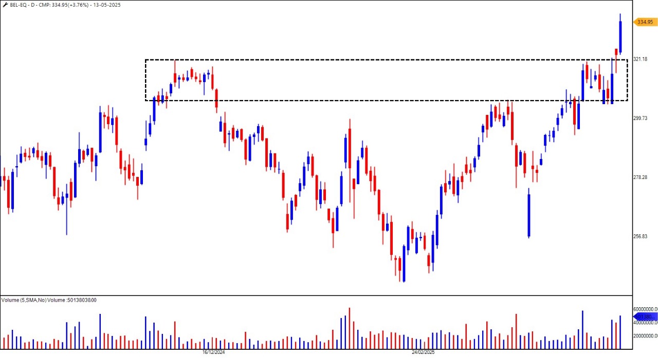 Bel的股价最近从9个月的合并阶段爆发,这表明势头强劲。 ₹340.50的高价可能是较小的阻力。