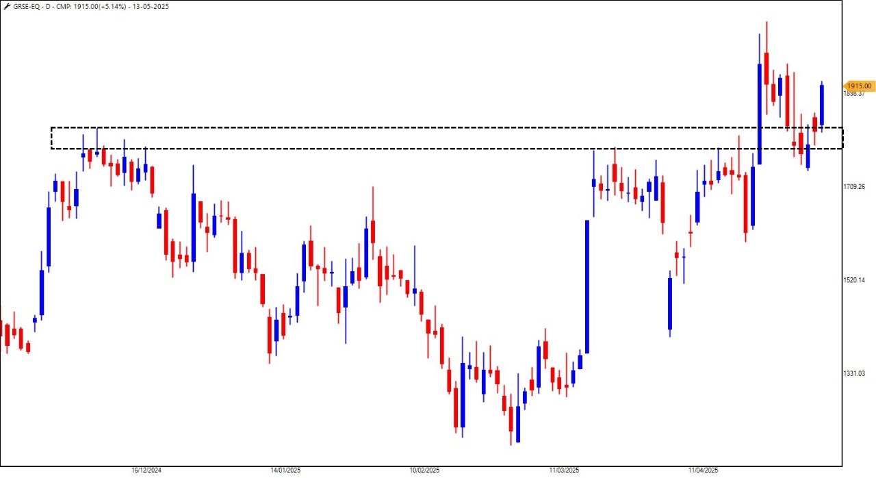 Grse的股票价格表现出强劲的技术表现,在2025年4月爆发之前,已经在范围内合并了大约五个月。突破后,股价重新测试了突破水平,从那时起,看涨的势头就恢复了。这表明GRSE有可能为新的集会提供准备,并支持对海军防御产品的需求不断增长。随着印度现代化的海军部队,Grse占据了良好的位置,可以捕捉这种增长的很大一部分。