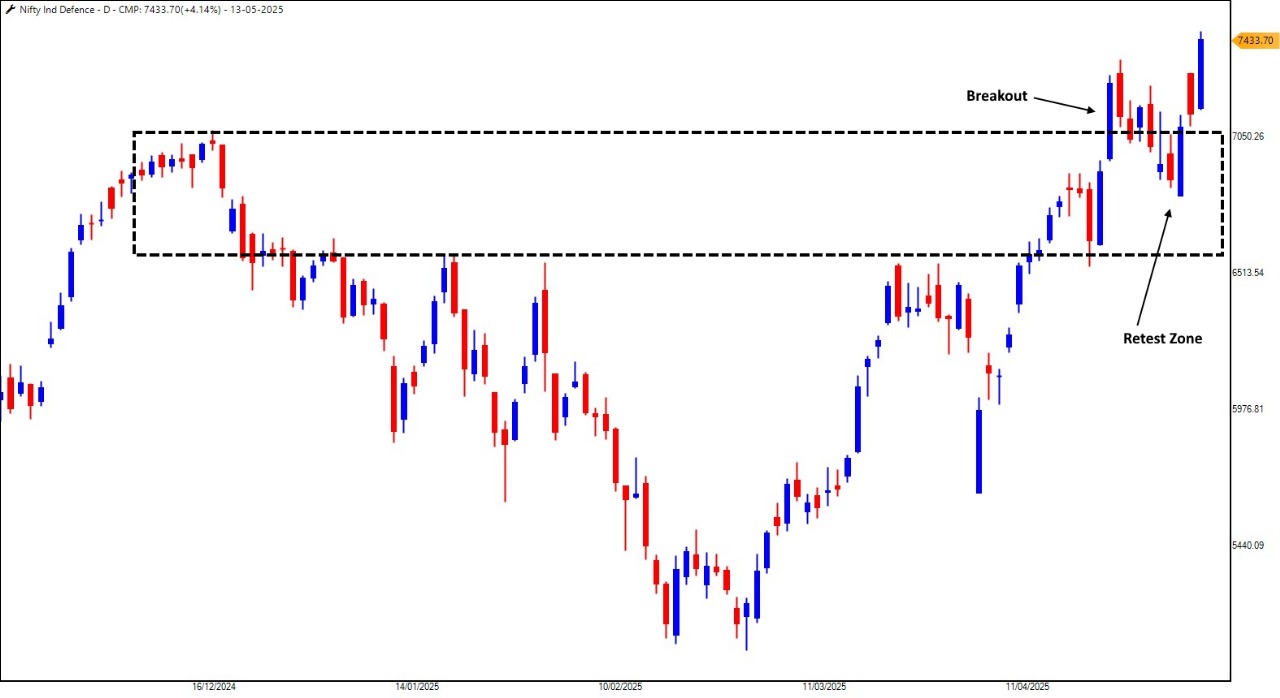 标志着印度主要国防公司表现的漂亮的印度国防指数一直处于稳固的向上轨迹。在2025年4月中旬,该指数达到了一个新的高位,这表明了国防部门的出色表现。接下来是5月的分支区的重新测试,这进一步肯定了看涨趋势的实力。