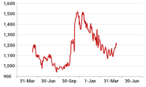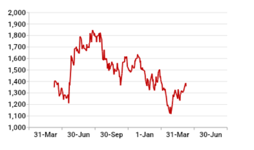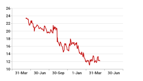 但是,如果我们看一下股价,过去一年的股价一直朝相反的方向发展。