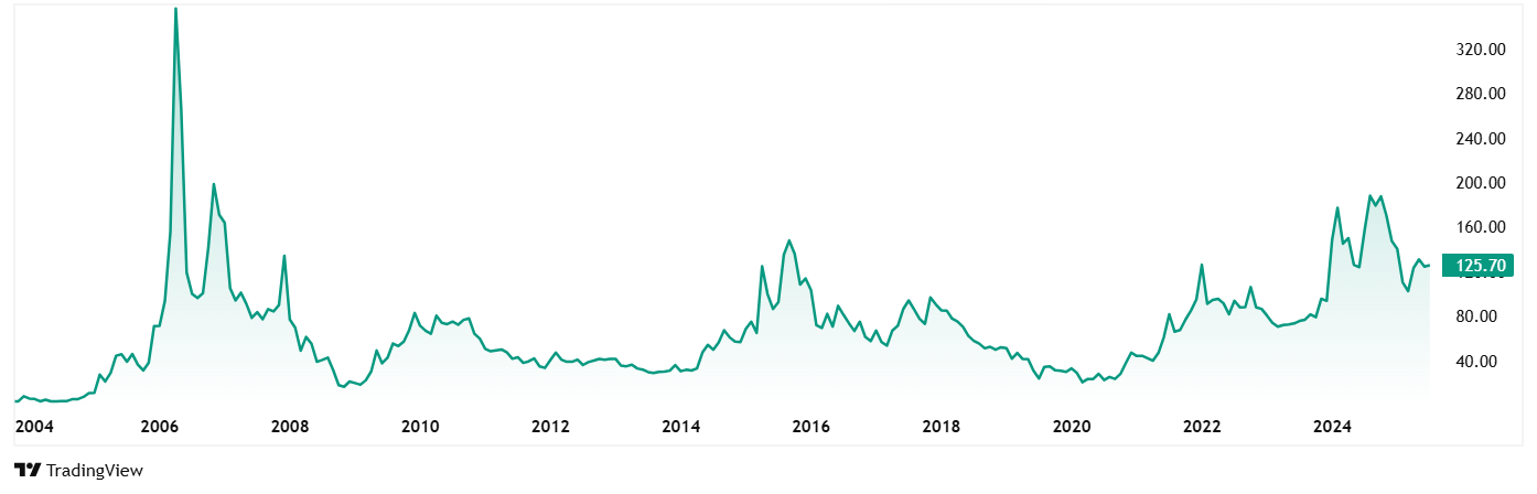 Ansal Buildwell Ltd的股价在2020年7月的25卢比左右,截至15Th 2025年7月,价格为126卢比,跃升了400%以上。 5年前投资于该股票的1卢比今天将有些超过5卢比的lacs。