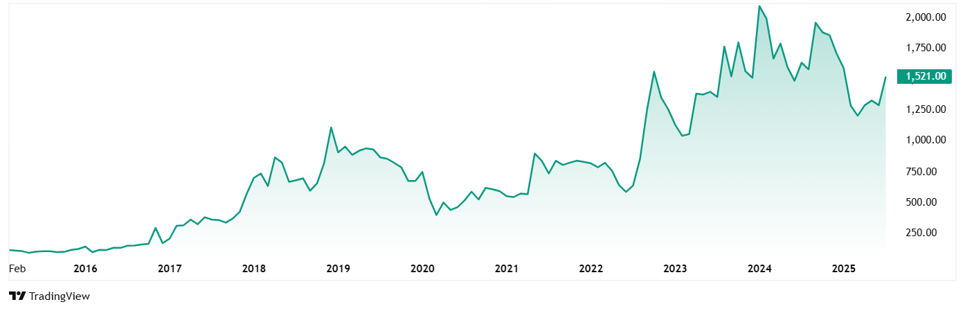 Apollo Sindoori酒店的股价在2020年7月的455卢比左右,截至15岁时Th 2025年7月,这是1,521卢比,在5年内跃升了235%。 5年前投资于股票的1卢比今天大约是3.4卢比。