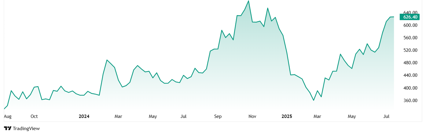 Yatharth医院和创伤护理服务有限公司的股价在2023年8月上市的330卢比左右,截至25岁时已增长到627卢比Th 2025年7月,这是90%的增长。