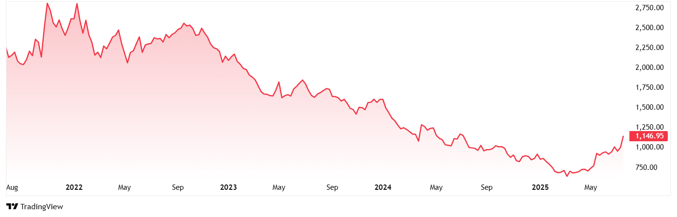 Tatva Chintan Pharma Chem Ltd的股价在2021年7月上市时约为2,265卢比。Th 2025年7月,价格为1,146卢比,几乎下降了50%。