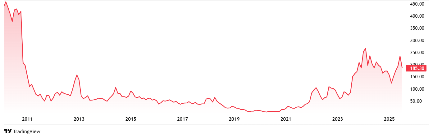 Valor Estate Ltd的股价在2020年7月的6卢比左右,截至25Th 2025年7月,它为185卢比,增长了几乎3,000%。