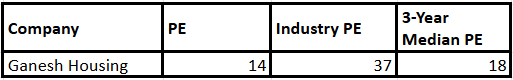 Ganesh住房交易的PE倍数为14。此估值低于18年的3年中位数,行业PE为37。