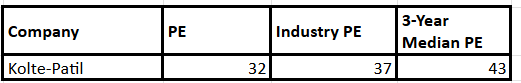 Kolte Patil的PE倍数为33。此估值低于43年的3年中位数和37个行业PE。