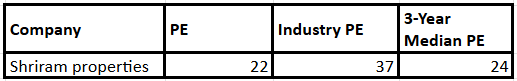 Shriram Properties的PE倍数为22。该估值低于24的3年中位数,行业PE为37。