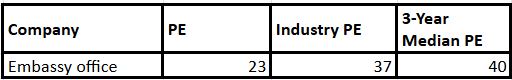 大使馆办公室以23的股权(PE)的价格交易。该估值低于40的3年中位数和37个行业PE。
