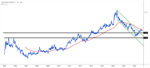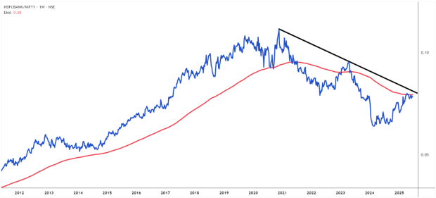 但是,也有一个警告信号。自2021年以来,该比率尚未超过其长期200周的指数移动平均线(WEMA),这表明HDFC银行并没有完全胜过银行的nifty。 HDFC银行仍在进行领导斗争。