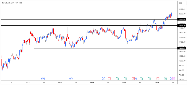 从每周的图表中看,我们看到HDFC银行已经摆脱了漫长的合并阶段,并进行了强烈的看涨重新测试。这表明它不仅与流有关。它正在转向整个索引。反过来,Nifty银行也提高了新的高点,这在很大程度上要归功于HDFC银行的势头。但是现在,最大的问题是, HDFC银行能否继续扮演骑师的角色并领导?
