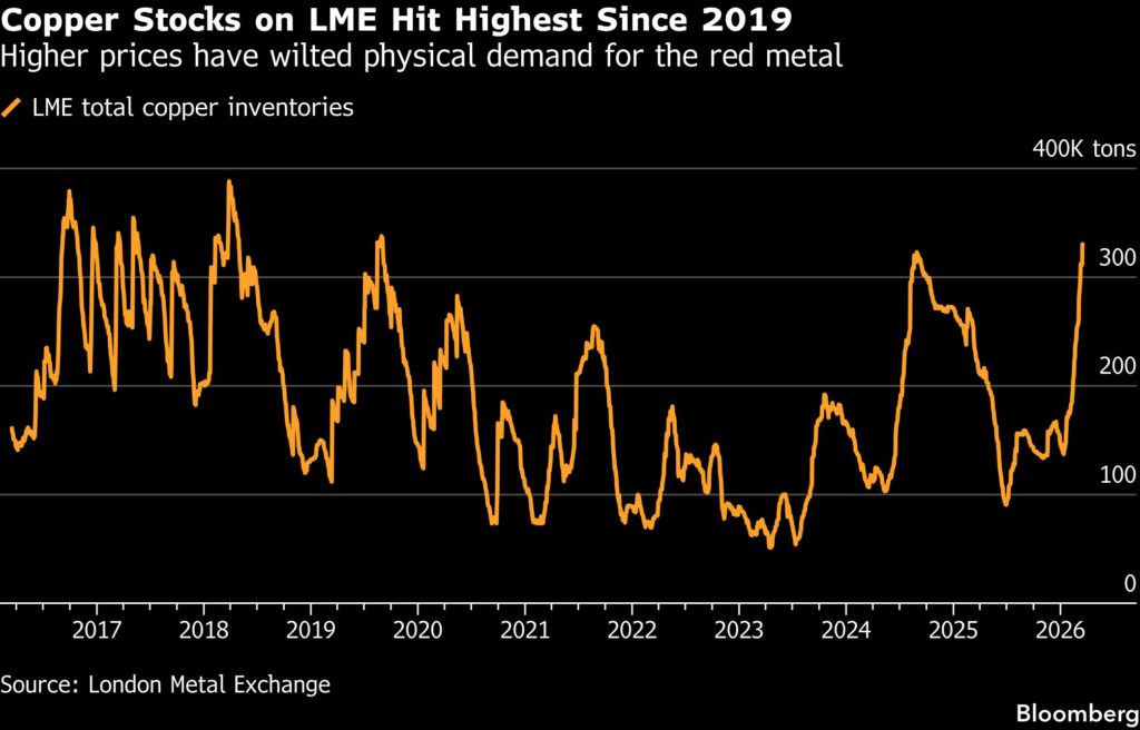 铜价下跌,伦敦金属交易所追踪的库存飙升至六年多来的最高水平,因实物金属需求继续受到价格上涨的压力。