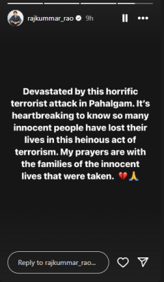拉杰·鲁(Rajkummar Rao)称这次袭击为恐怖主义行为。他在Instagram的故事中写道:“这次在Pahalgam的恐怖袭击使人感到震惊。知道这么多无辜的人在令人发指的恐怖主义行为中丧生真是令人心碎。”他与失去生命的无辜家族分享了祈祷。