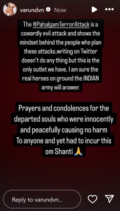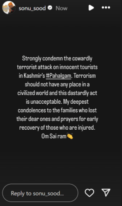 索努·苏德(Sonu Sood)与受害者家属分享了他的慰问,他还写道:“强烈谴责对克什米尔#Pahalgam对无辜游客的胆怯的恐怖袭击。恐怖主义在文明世界中不应在文明世界中有任何地位,而这种卑鄙的行为是不可接受的。”