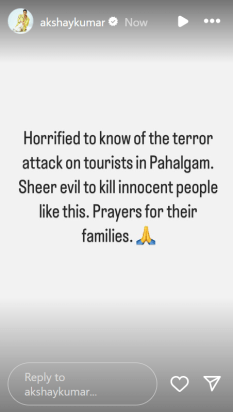 阿克沙伊·库马尔(Akshay Kumar)写了关于他的Instagram故事的可怕攻击。他写道:“吓坏了帕哈尔加姆对游客的恐怖袭击。纯粹的邪恶杀害这样的无辜者。为家人祈祷(手加入表情符号)。”