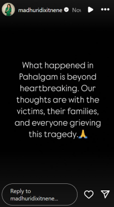 帕哈尔加姆恐怖袭击发生后,马德里·迪克西特(Madhuri Dixit)向受害者及其家人表示哀悼。她写道:“帕哈尔加姆(Pahalgam)发生的事情令人心碎。我们的想法与受害者,他们的家人以及每个人都为这场悲剧感到悲伤。”