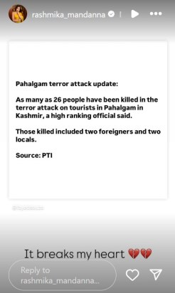 Rashmika Mandanna在她的Instagram故事中分享了新闻的屏幕截图,并写道:“这让我心碎。”