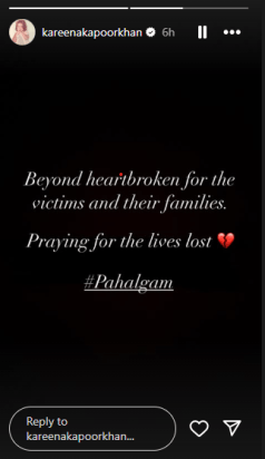 她写道:“卡雷娜·卡普尔(Kareena Kapoor)分享了这一事件令人心碎的事,“为受害者及其家人伤心欲绝。为失去的生命祈祷(心脏表情符号)#pahalgam。”