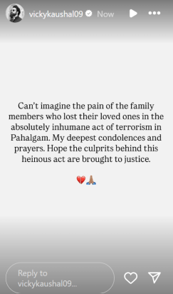 卡特里娜飓风的丈夫Vicky Kaushal也分享了一个关于Pahalgam恐怖袭击的故事,写道:“无法想象在Pahalgam中绝对不人道的恐怖主义行为中失去亲人的家庭成员的痛苦。我最深切的慰问和祈祷。希望这种令人发指的行为背后的罪魁祸首能给人带来正义的罪魁祸首。”