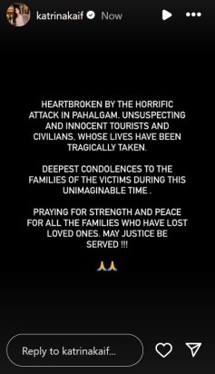 卡特里娜·凯夫(Katrina Kaif)在Instagram上发表了一个故事,他说:“帕哈尔加姆(Pahalgam)的恐怖袭击,毫无戒心的和无辜的游客和平民的恐怖袭击使他们的生活受到了悲惨的痛苦。在这个难以想象的时代,对受害者家属的最深切的哀悼。”