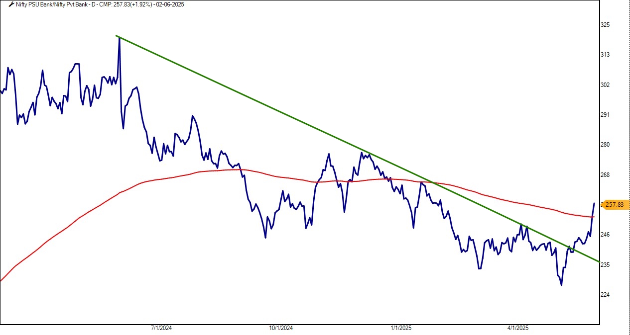查看Nifty PSU银行与Nifty私人银行(PVT银行)的比率图表,明显的表现趋势正在出现。该比率的斜率已经向北转,这意味着PSU银行开始表现优于其私人同行。随着比率的移动超过其200天的指数移动平均值(200 dema),PSU银行持续超越表现的可能性增加,进一步增强了该行业周围的积极情绪。