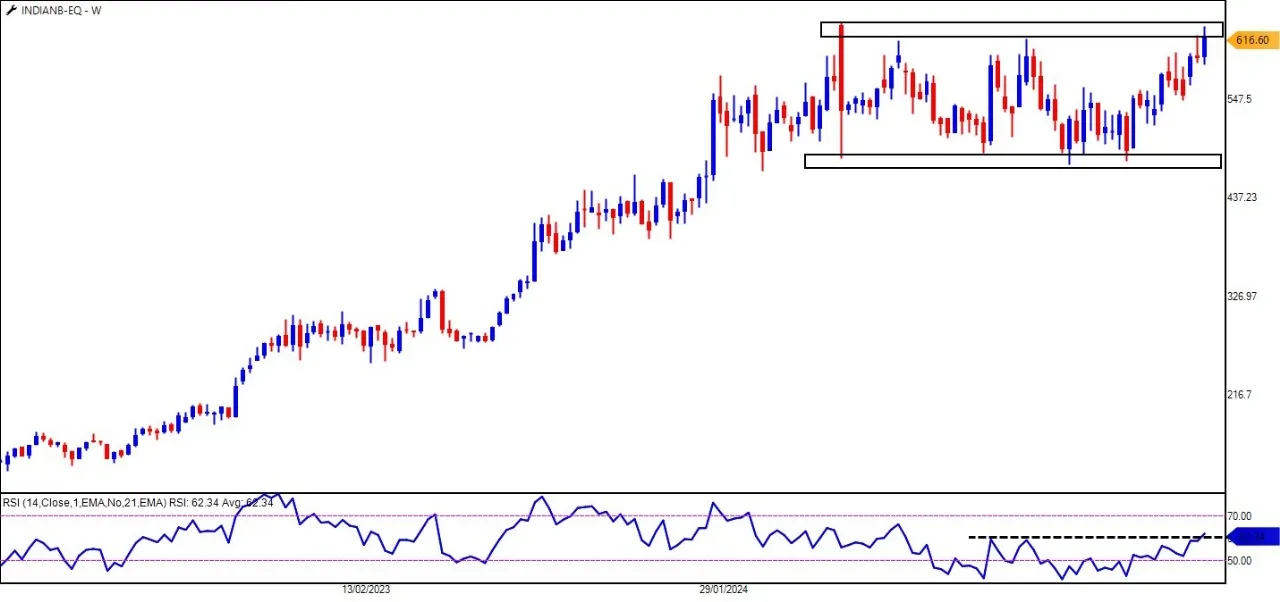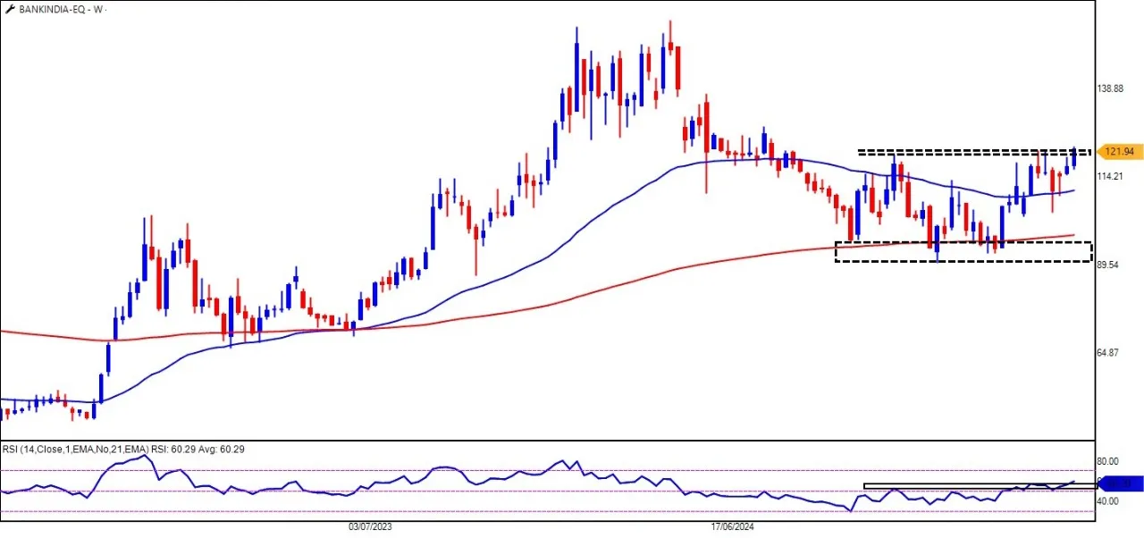 每周图表上的RSI已经从其阻力区域中拆除,表明动量正在转移,而转移了公牛。这增加了印度银行的潜在看涨案件,这表明这可能是PSU银行领域的首选。