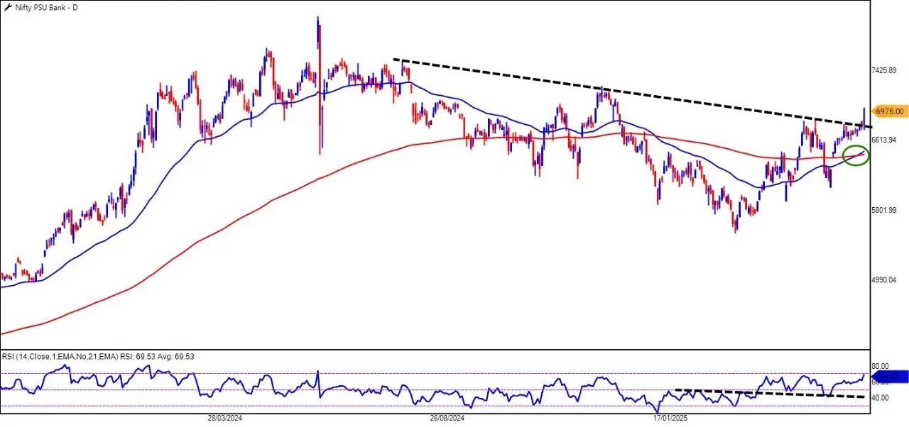 在每日图表上,Nifty PSU银行指数引起了令人兴奋的突破,超过了10个月的趋势线。这标志着市场情绪的转变,指数转移到看涨领土。金十字架进一步证实了移动平均值的突破,这是一种经典的技术信号,突出了潜在的上升趋势。